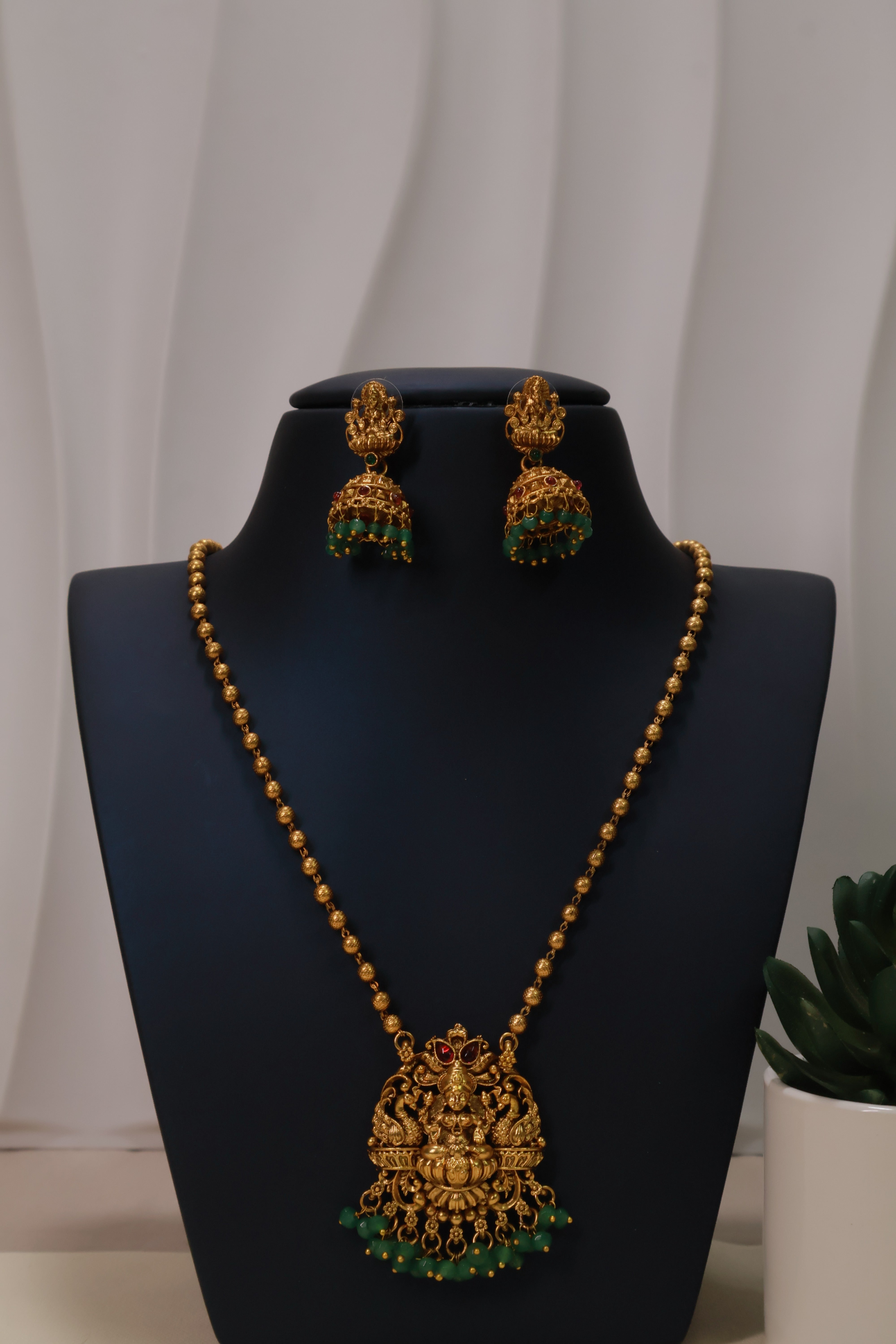 This captivating temple jewelry set features a stunning Goddess Lakshmi pendant, symbolizing prosperity and divine grace. Crafted in antique gold finish, the intricate detailing of the pendant is accentuated with red and green stone embellishments and delicate green bead danglings. The necklace is designed with classic gold beads for a traditional touch, perfectly complemented by matching jhumka earrings adorned with similar motifs. Ideal for weddings, festivals, and traditional ceremonies, this set radiates timeless beauty and cultural heritage.