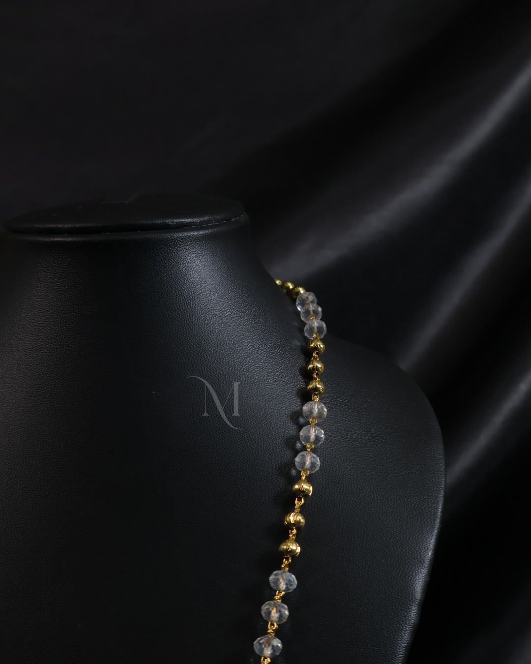 This refined necklace features a delicate arrangement of translucent grey beads, each linked with elegant gold-toned connectors for a timeless appeal. The subtle shimmer of the beads paired with the warm gold finish creates a balanced look that complements both modern and traditional outfits. Lightweight and versatile, this piece is perfect for daily wear or special occasions, adding understated sophistication to any ensemble.