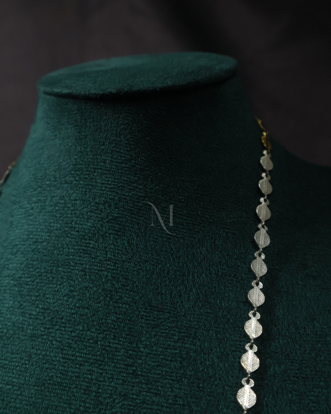 A beautifully handcrafted long chain necklace featuring a striking combination of silver and gold-toned discs in a symmetrical design. Its sleek yet traditional style makes it perfect for pairing with ethnic attire during weddings, festivals, or special occasions. Lightweight and versatile, this piece adds a graceful charm to any look.