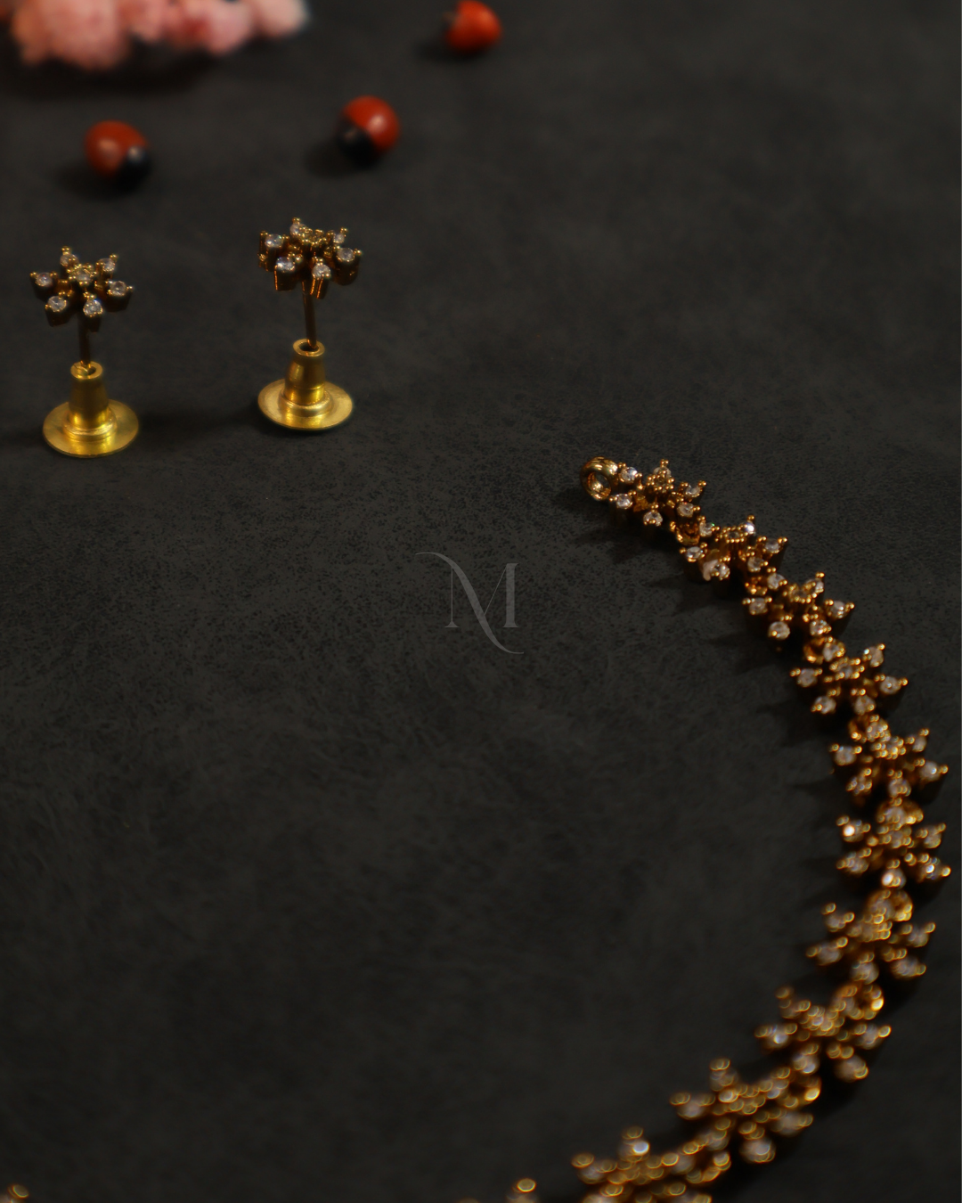 Delicate and dazzling, this floral-inspired diamond necklace set exudes sophistication and charm. Crafted in gold with sparkling diamond embellishments, each petal-like design reflects light beautifully, adding a radiant glow to your look. Paired with matching floral stud earrings, this set is perfect for weddings, festive gatherings, or any occasion where you want to shine with understated elegance.