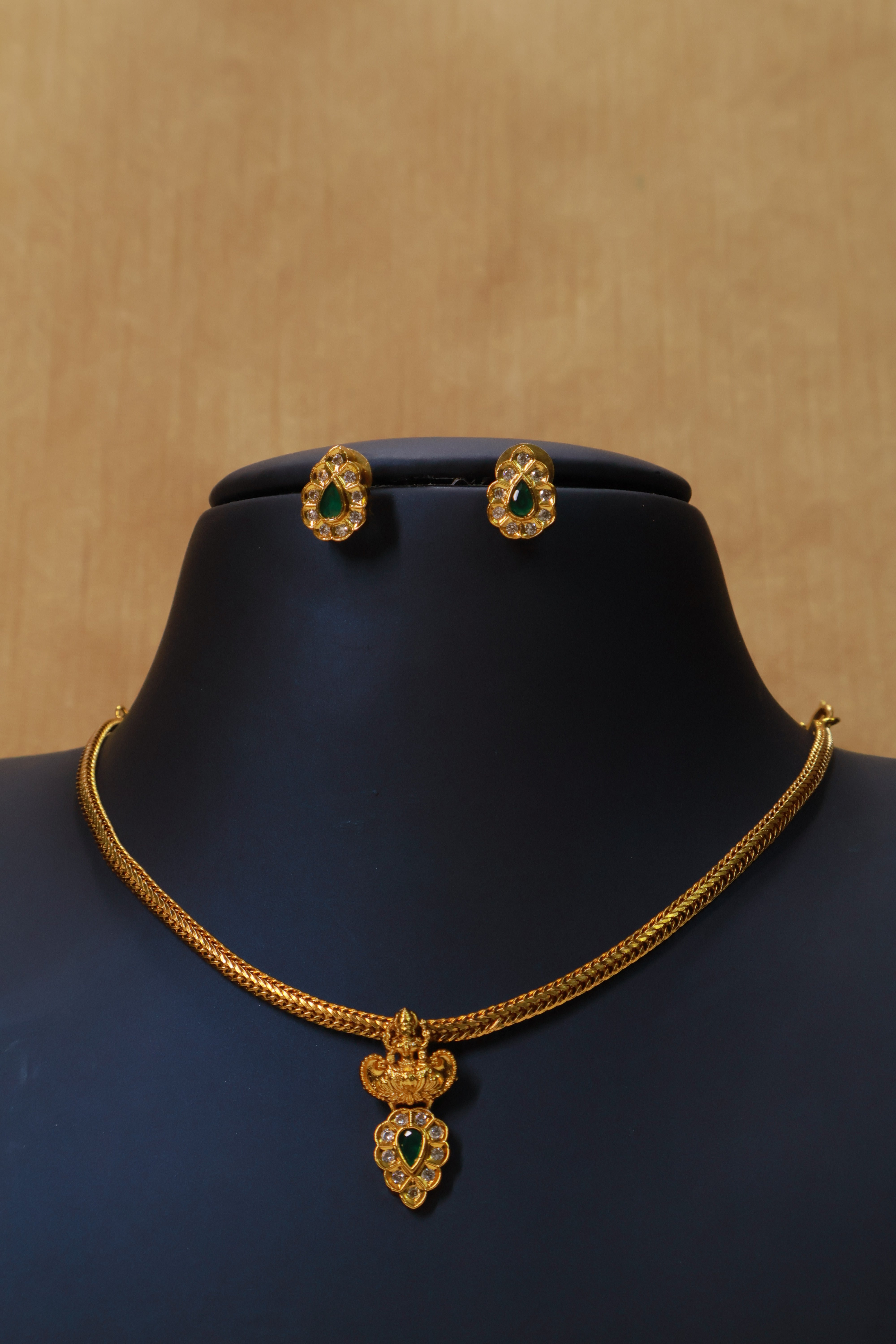This exquisite gold necklace set features a delicate chain with an intricately crafted pendant adorned with a teardrop-shaped emerald centerpiece surrounded by sparkling stones. The matching earrings mirror the pendant’s design, combining elegance and sophistication. Perfect for traditional occasions and festive celebrations, this timeless jewelry piece radiates classic charm and grace.
