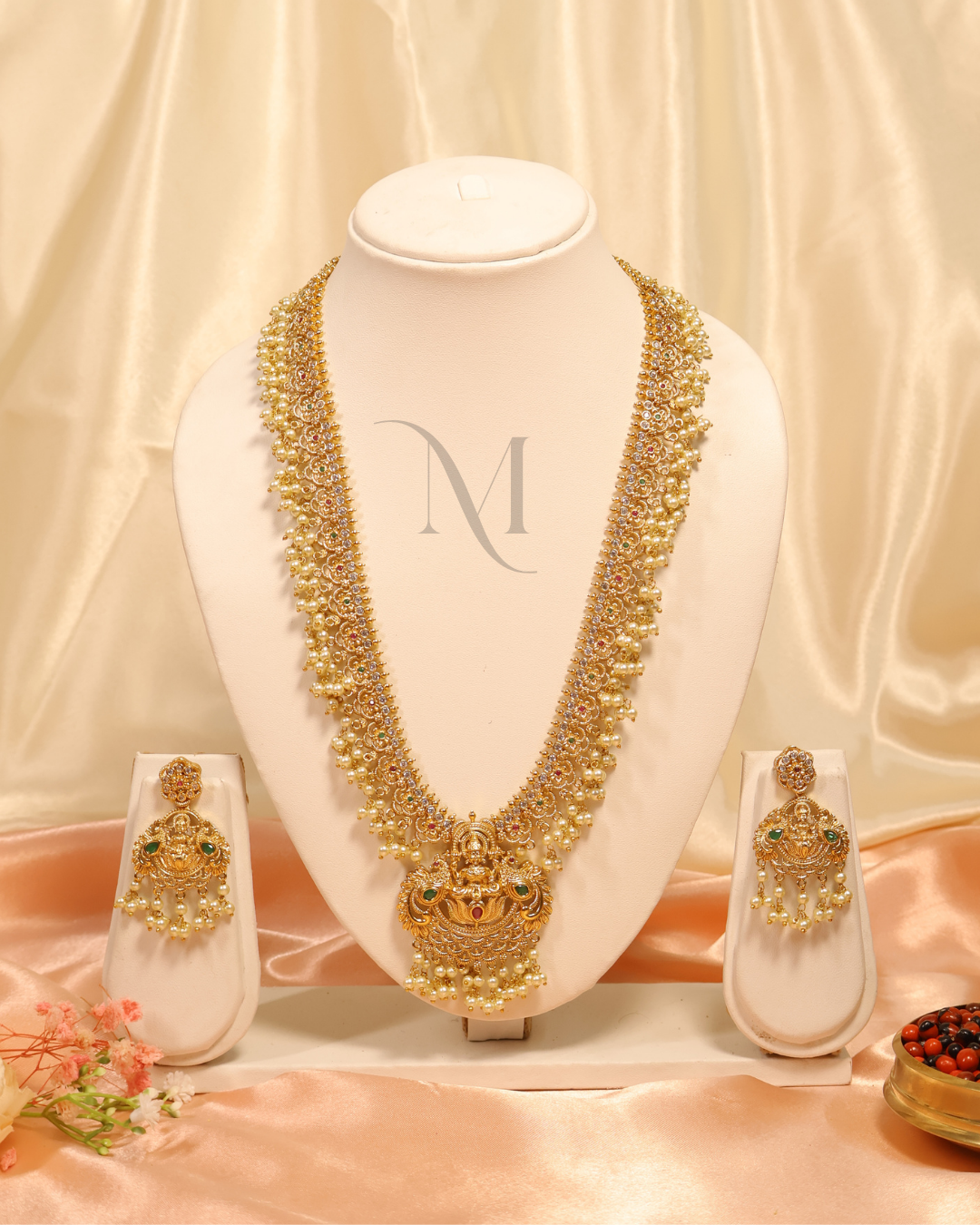 This exquisite temple jewelry set radiates divine charm, featuring a finely crafted Goddess Lakshmi pendant adorned with green and red stone accents. The necklace is embellished with delicate pearl hangings along the intricate gold-toned design, exuding a graceful and regal aura. Matching statement earrings with cascading pearls complete the look, making it perfect for weddings, festive occasions, and traditional celebrations.
