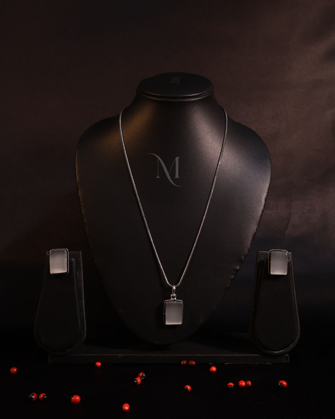 This sophisticated jewelry set features a sleek silver chain paired with a rectangular frosted stone pendant, framed in a delicate silver border. Matching stud earrings mirror the pendant’s design, creating a harmonious and modern look. Perfect for both casual and formal occasions, the set exudes minimalist elegance, with the frosted finish adding a soft, refined touch. Displayed against a luxurious deep green fabric backdrop with scattered red beads, the presentation enhances its chic and timeless appeal.