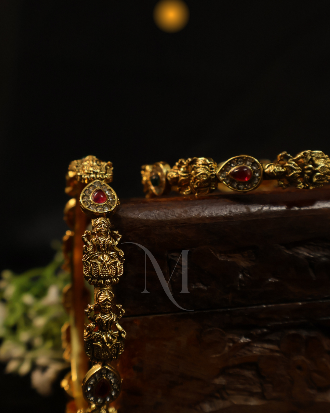 Exquisite antique gold bangles adorned with intricate temple-inspired carvings and teardrop-shaped red gemstone accents. Displayed elegantly against a carved wooden box with delicate floral hints in the background, these bangles capture the essence of heritage craftsmanship and timeless elegance, ideal for traditional celebrations.