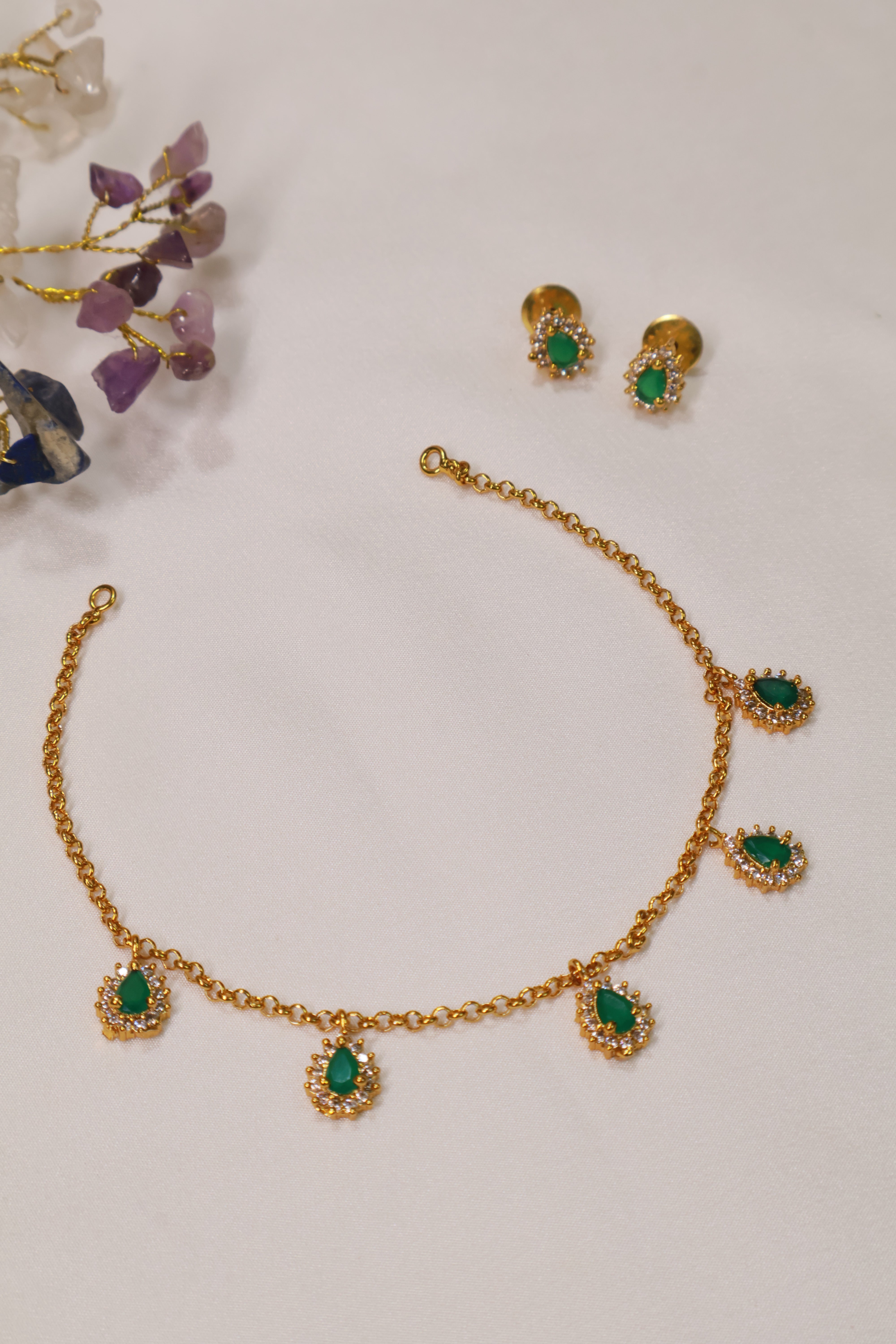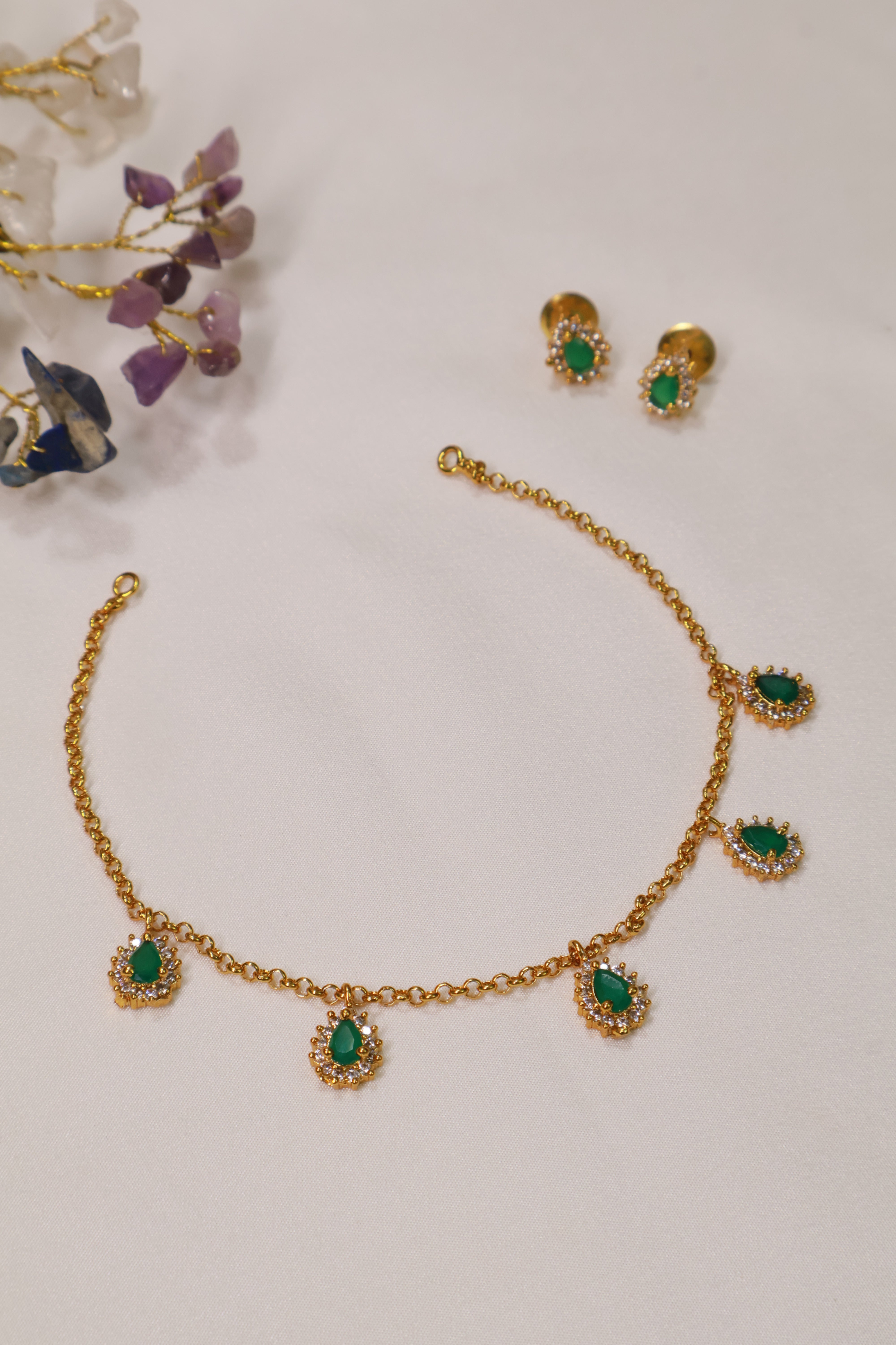 This charming gold chain set showcases alternating ruby and emerald teardrop pendants, each beautifully framed with sparkling white stones for a touch of brilliance. The matching stud earrings echo the same gemstone design, creating a cohesive and elegant look. Ideal for both festive and casual occasions, this lightweight jewelry set adds a subtle pop of color and timeless sophistication to any outfit.