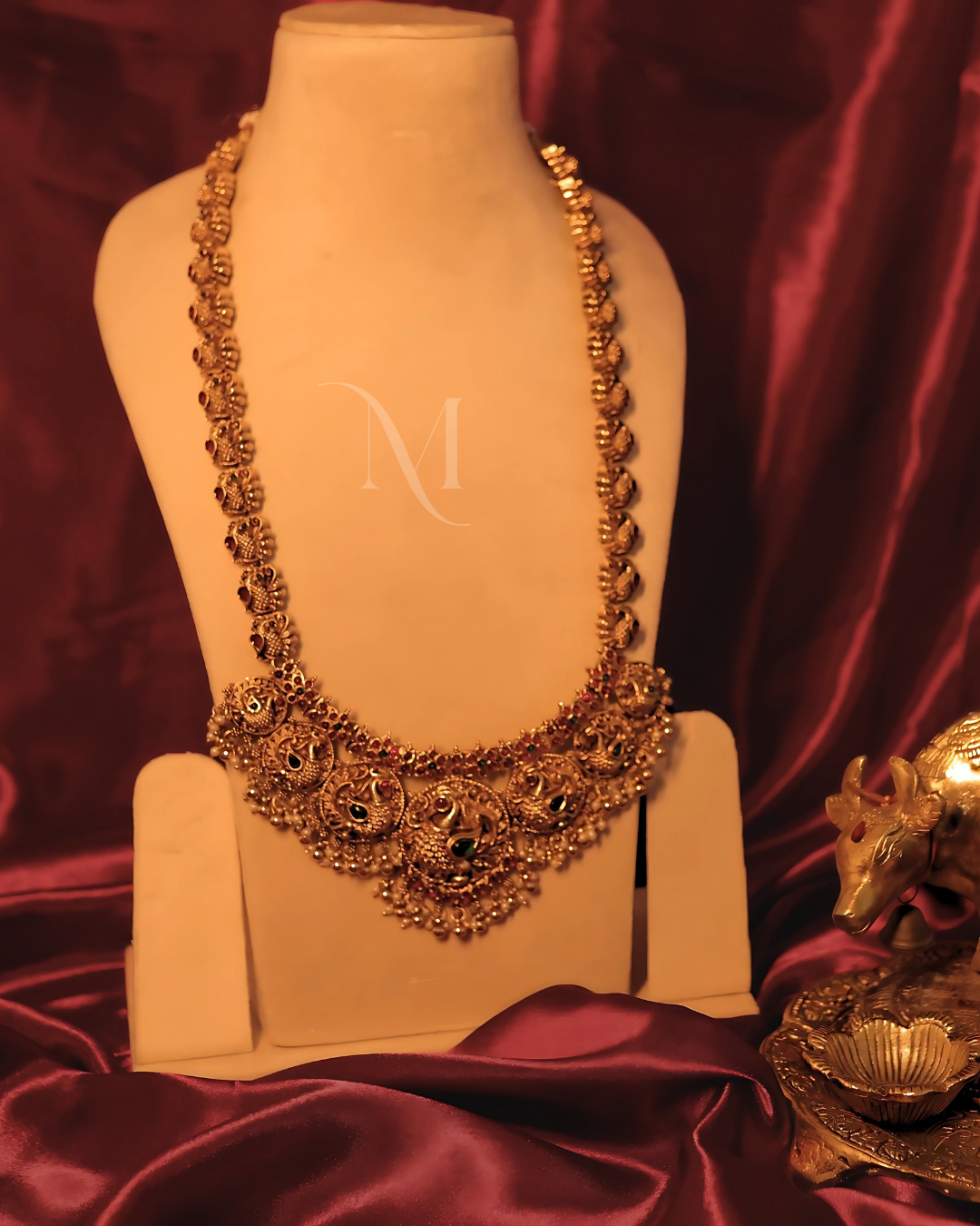 This majestic antique-finish temple necklace is a masterpiece of traditional craftsmanship, featuring ornate peacock motifs adorned with rich ruby-red and emerald-green stones. The bold design is enhanced with intricate detailing, delicate gold bead hangings, and a regal arrangement of sculpted patterns. Perfect for bridal wear and grand festive occasions, this necklace exudes opulence and timeless heritage elegance.