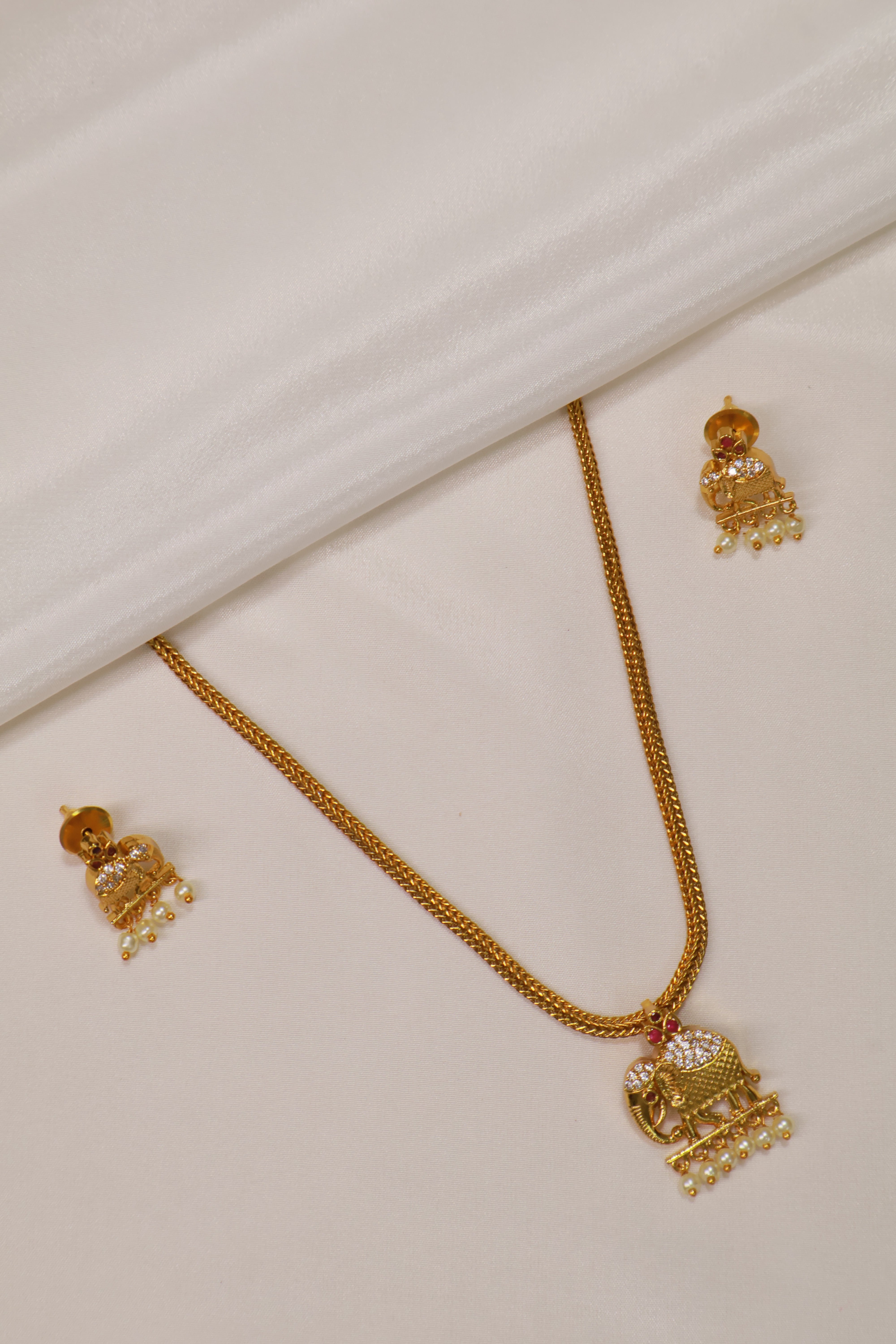 This exquisite necklace set features a beautifully crafted gold-tone chain adorned with a detailed elephant pendant — a symbol of strength, wisdom, and prosperity. The pendant is embellished with sparkling stones and delicate pearl danglings, adding a touch of grace to its regal charm. Complemented by matching jhumka-style earrings decorated with tiny pearls, this set blends traditional craftsmanship with timeless elegance, making it perfect for festive celebrations and ethnic occasions.