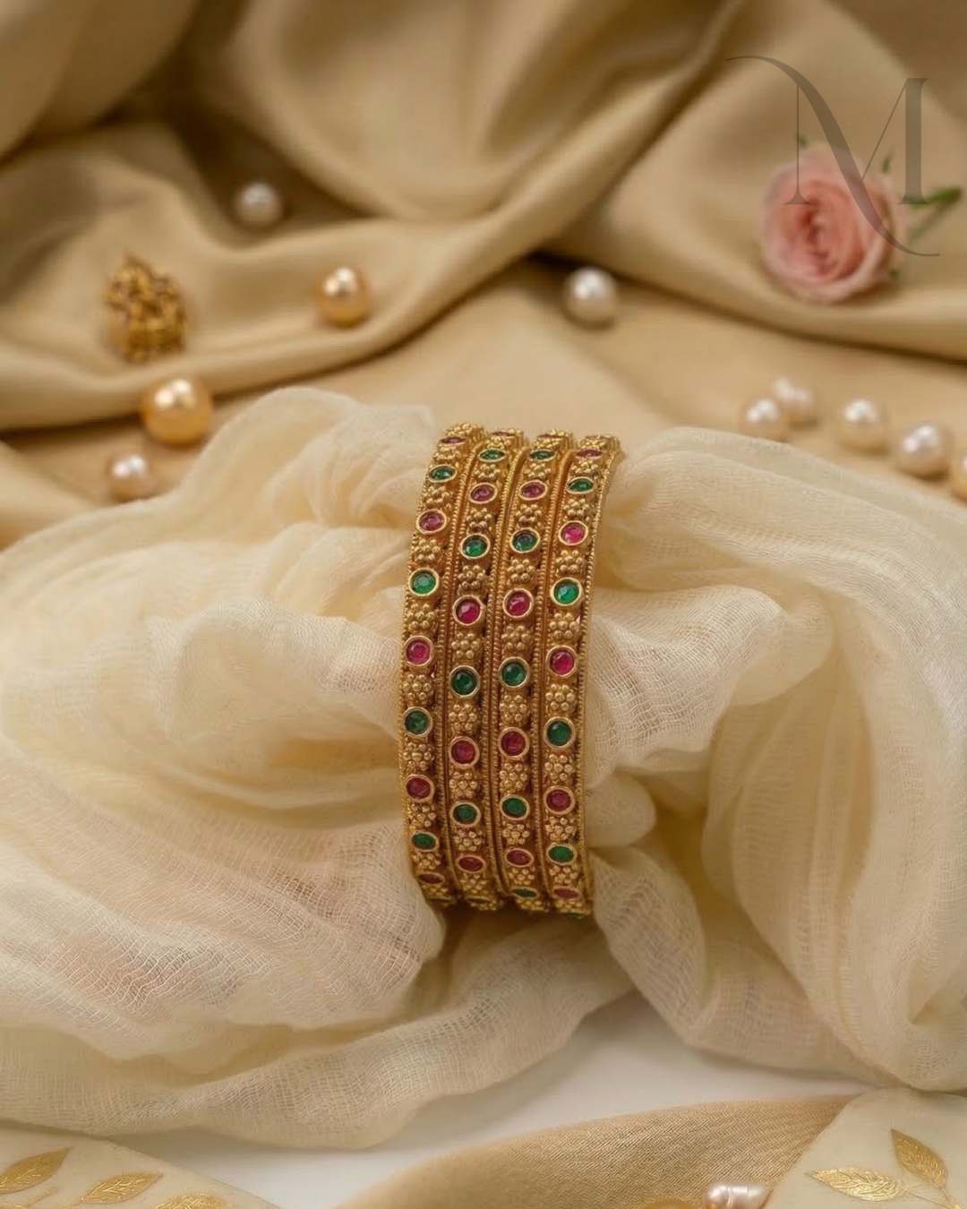 Designed with delicate ruby pink and emerald green stones set within intricate gold bead detailing, these bangles reflect the richness of classic South Indian jewellery.