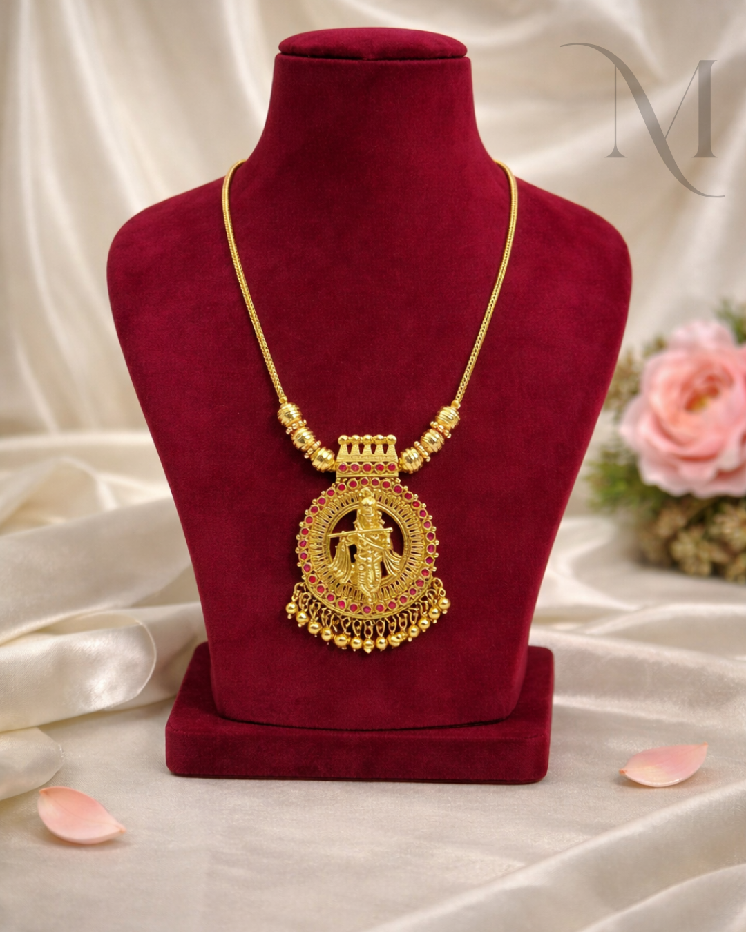 The intricately crafted pendant features Lord Krishna playing the flute, surrounded by delicate ruby-tone stones and traditional temple detailing.