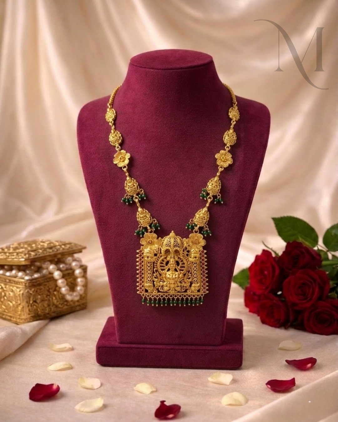 Inspired by the divine aura of temple jewellery, the Padma Lakshmi Thidambu Haram features an intricately carved Lakshmi pendant seated within a majestic temple frame.
