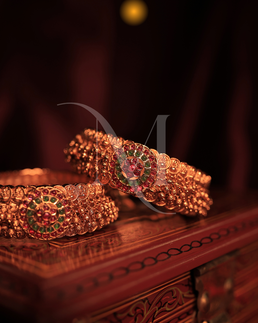 Elevate your ensemble with these premium antique-finish gold bangles, adorned with intricate detailing and crowned by a stunning multicolor Kundan floral centerpiece. Each bangle showcases fine craftsmanship through layers of textured gold beads and engraved patterns, radiating royal grandeur. The combination of ruby, emerald, and white Kundan stones adds a vibrant yet traditional charm. Perfectly presented on an ornately carved wooden chest, these bangles are ideal for brides, festive wear, or anyone seeking timeless elegance with a luxurious touch.