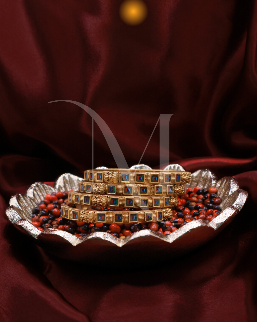 A stunning set of traditional gold bangles, adorned with intricate square motifs in vibrant hues of red, blue, and green, rests gracefully in a silver petal-shaped bowl filled with colorful beads. Set against a rich maroon silk backdrop, this piece exudes royal charm and timeless craftsmanship, perfect for special occasions and cultural celebrations.