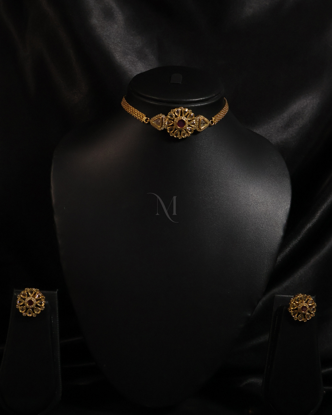 Radiate timeless elegance with this exquisitely crafted gold choker set, featuring a captivating ruby centerpiece surrounded by intricate floral-inspired detailing. The delicate mesh chain adds sophistication, while the matching stud earrings complete the look with grace. Perfect for weddings, festive occasions, or grand celebrations, this set blends traditional artistry with a royal charm that never goes out of style.