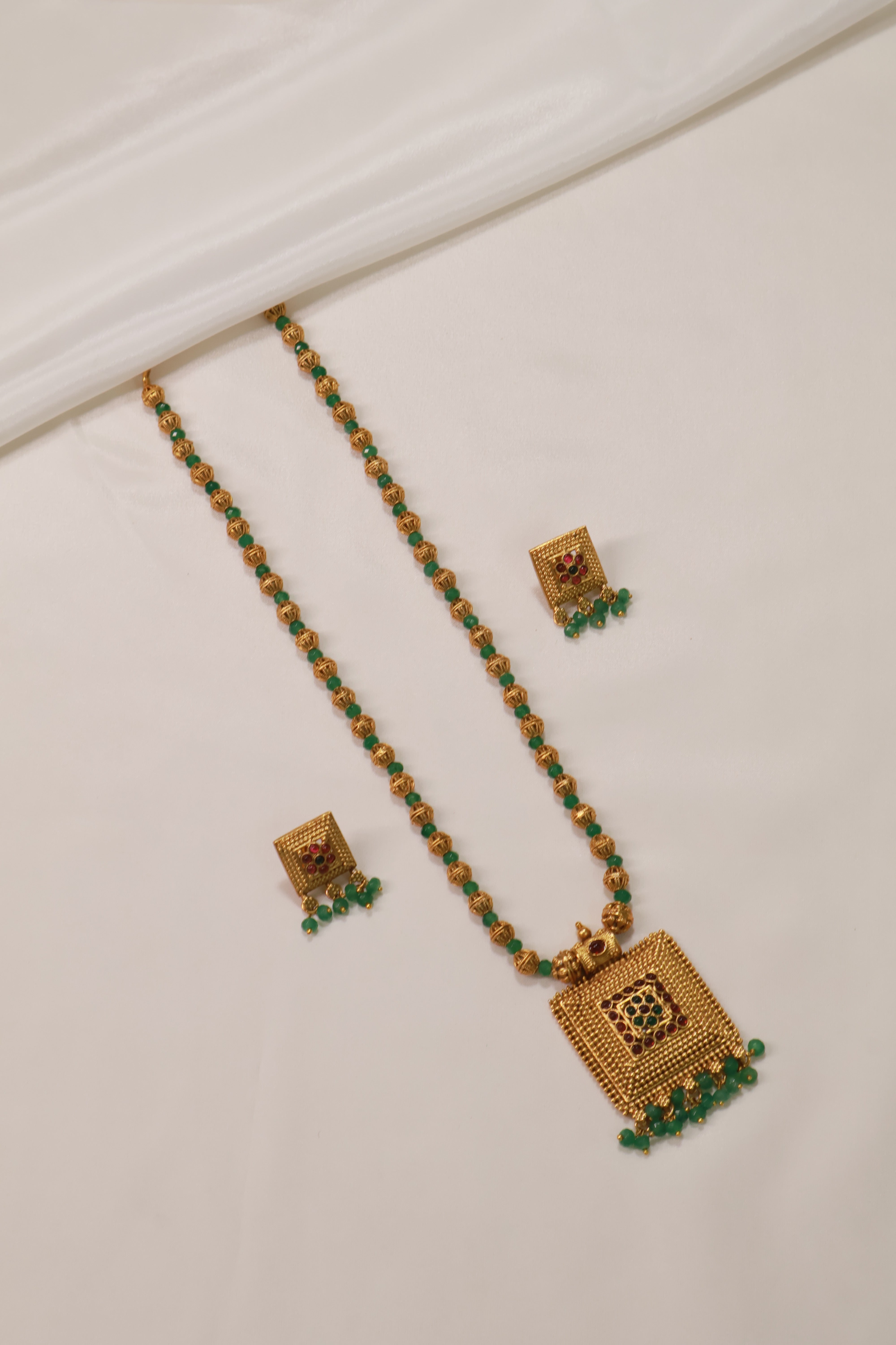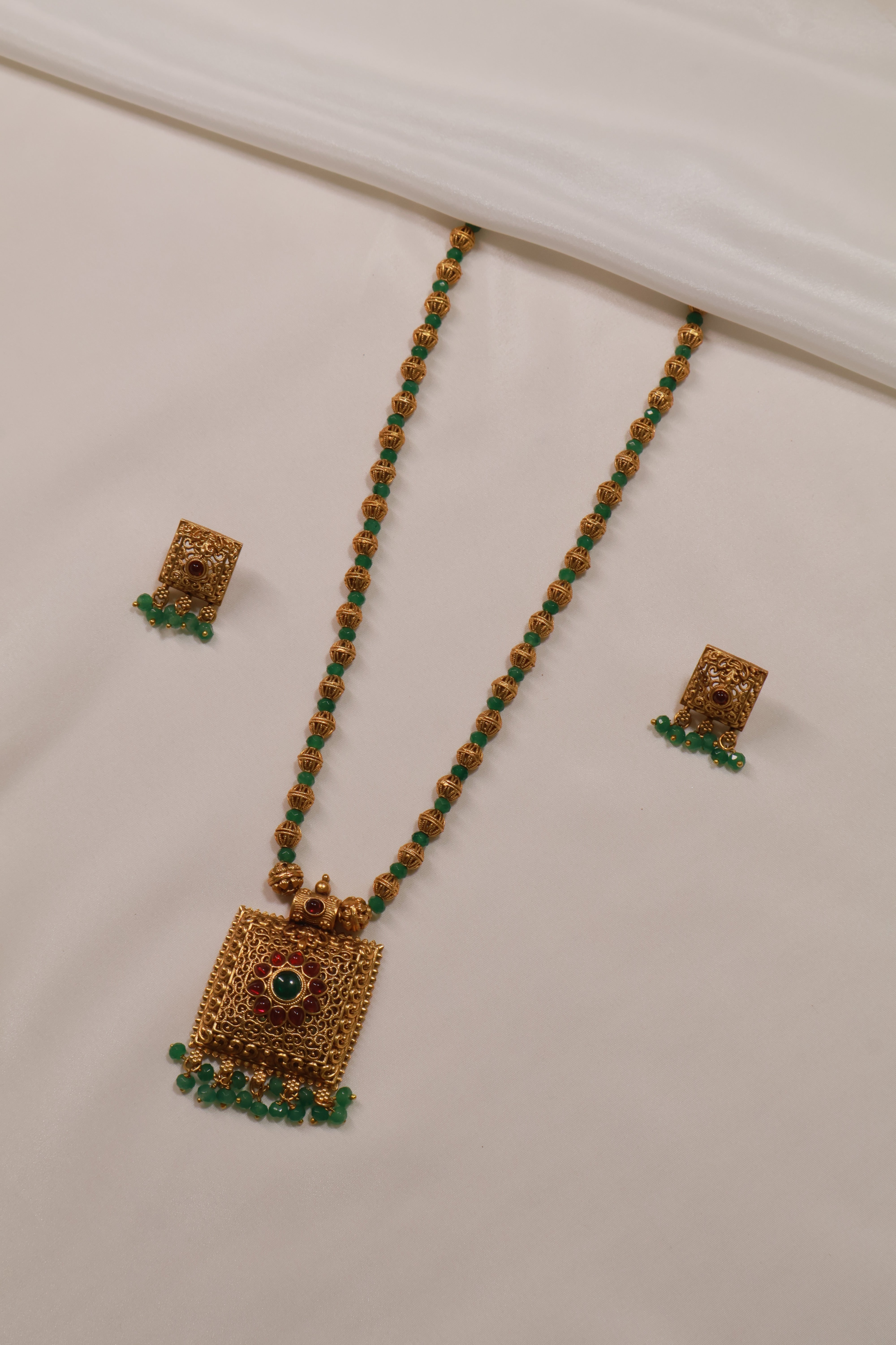 This elegant necklace set exudes traditional charm with its intricate square pendant design and temple-inspired detailing. The necklace features alternating gold-toned and green beads, enhancing its royal aesthetic. The square pendant is embellished with tiny red and green accents, complemented by green bead danglings that add a graceful touch. Paired with matching square earrings that mirror the pendant’s motif, this set is a perfect blend of cultural artistry and timeless sophistication — ideal for festive and traditional occasions.