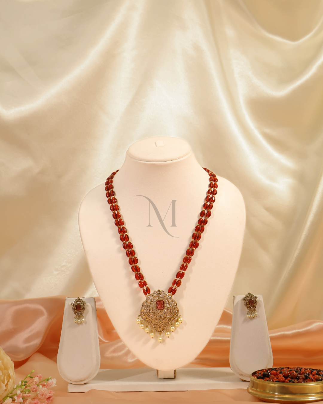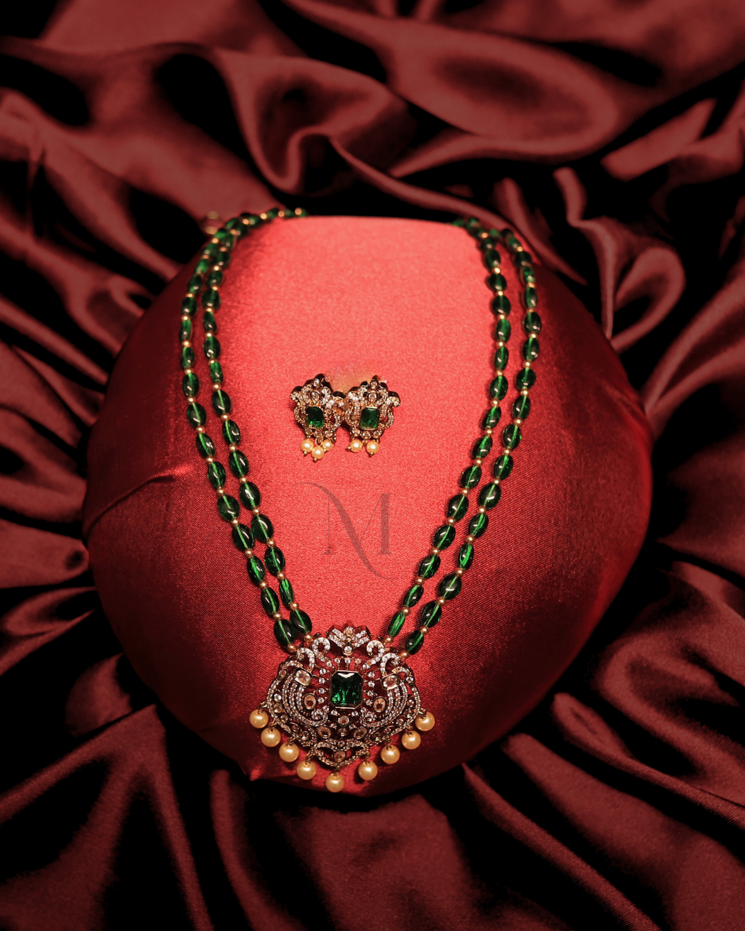 This elegant necklace features a double strand of lustrous ruby-red beads, exuding a rich and regal charm. At its heart lies an intricately crafted pendant, adorned with a central ruby stone, surrounded by delicate gold-toned detailing and shimmering accents. Dangling pearl drops add a graceful finish, enhancing its traditional appeal. Accompanied by matching stud earrings, this set is perfect for festive occasions, weddings, and special cultural celebrations.