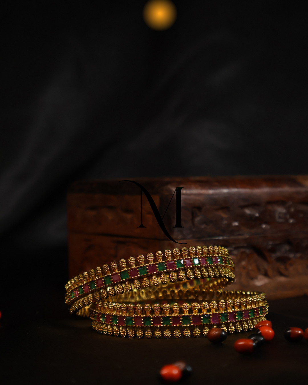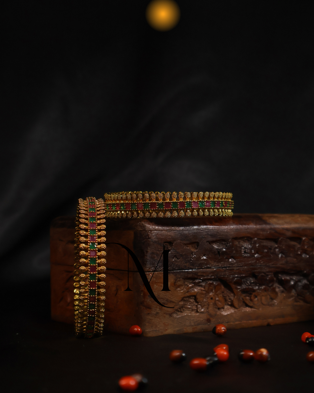 This exquisite pair of bangles features a vibrant lattice of alternating ruby-red and emerald-green stones, framed by a textured gold border that adds dimension and richness. The intricate craftsmanship and symmetry make these bangles a standout accessory — perfect for festive celebrations, weddings, or simply to add a touch of luxury to your ensemble. Styled against an open book and rich velvet, the scene exudes quiet sophistication and timeless charm.