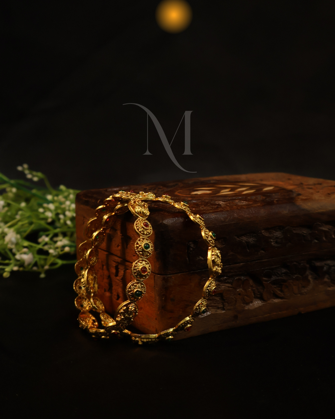 A pair of intricately designed antique gold bangles, adorned with vibrant green and red gemstones and detailed temple motifs of divine figures. Resting on a carved wooden box with soft floral accents in the background, these bangles exude traditional elegance and spiritual charm, perfect for festive and ceremonial wear.