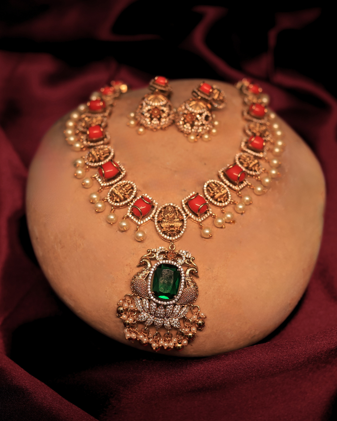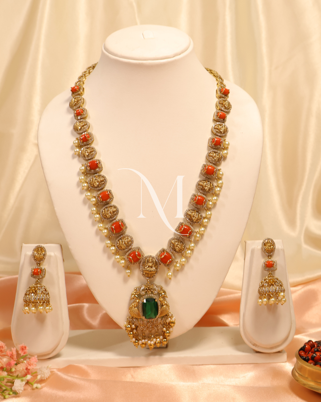 featuring alternating antique Lakshmi motifs and bold coral-red