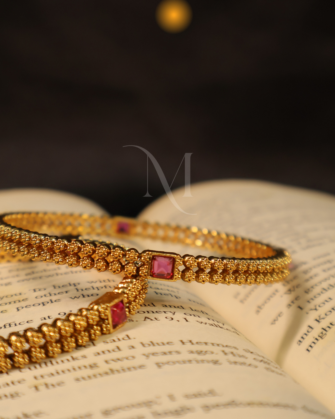 Elegant gold bangles adorned with intricate floral patterns and highlighted by striking ruby-red square stones. Placed gracefully over the pages of an open book, these bangles blend the charm of traditional craftsmanship with a touch of literary romance, making them perfect for both everyday elegance and special occasions.