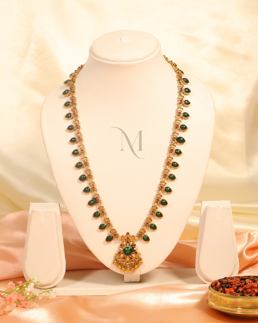 This captivating gold necklace features alternating emerald-green stone droplets and ruby-red accents, exuding a rich and royal aura. The intricate pendant is adorned with a central green gemstone, framed by delicate gold detailing and tiny golden beads for added elegance. Perfect for weddings, festive occasions, and cultural celebrations, this piece blends traditional craftsmanship with timeless beauty.
