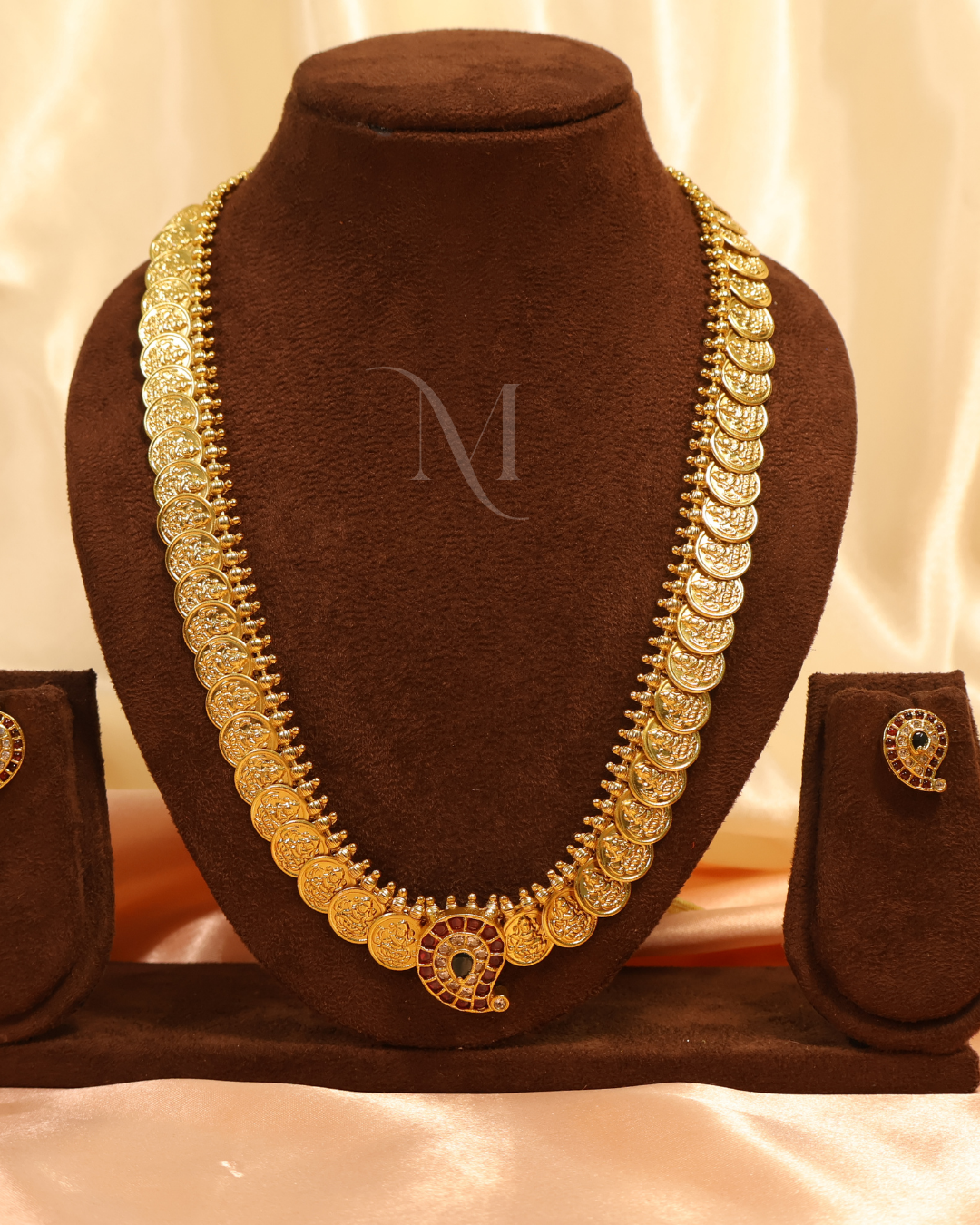 Inspired by timeless South Indian heritage, this traditional gold-toned necklace features a graceful array of embossed coin motifs symbolizing prosperity and tradition. The centerpiece is accentuated with a red and green stone inlay, adding a rich touch of color. Paired with matching stud earrings, this set is perfect for weddings, festive occasions, and cultural celebrations, offering an elegant blend of classic charm and regal sophistication.