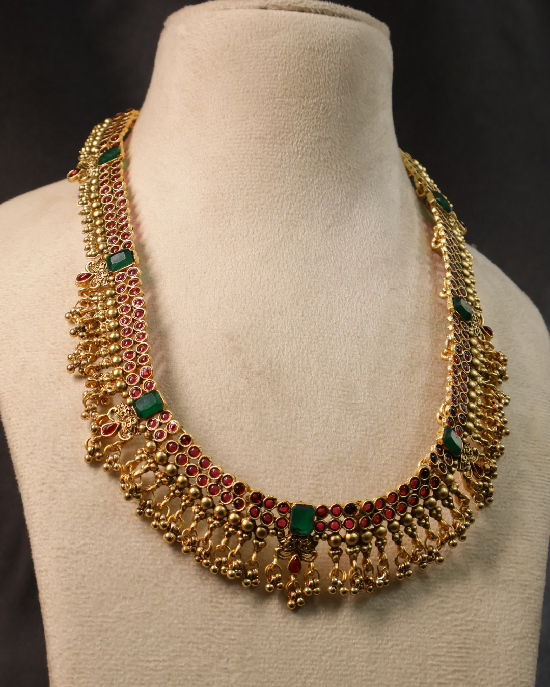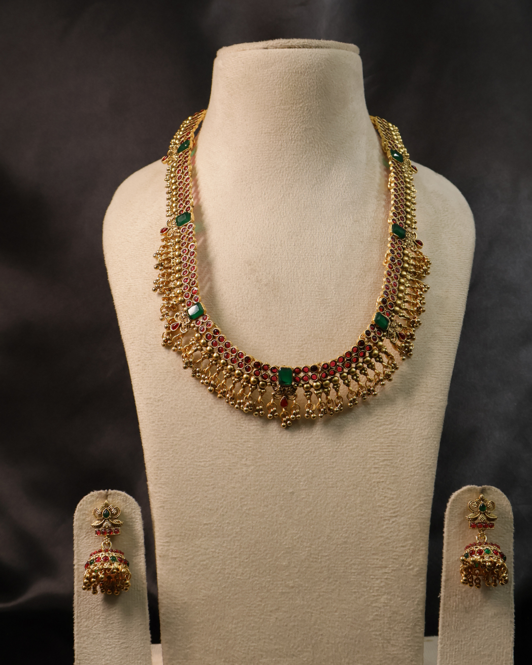 This exquisite necklace features a classic South Indian design, adorned with vibrant red kemp stones and striking green accents. The intricate gold framework is embellished with delicate dangling beads, adding movement and charm to the piece. Paired with matching jhumka earrings decorated with red and green stones, this set is perfect for weddings, temple ceremonies, and festive occasions, offering a timeless touch of heritage elegance.