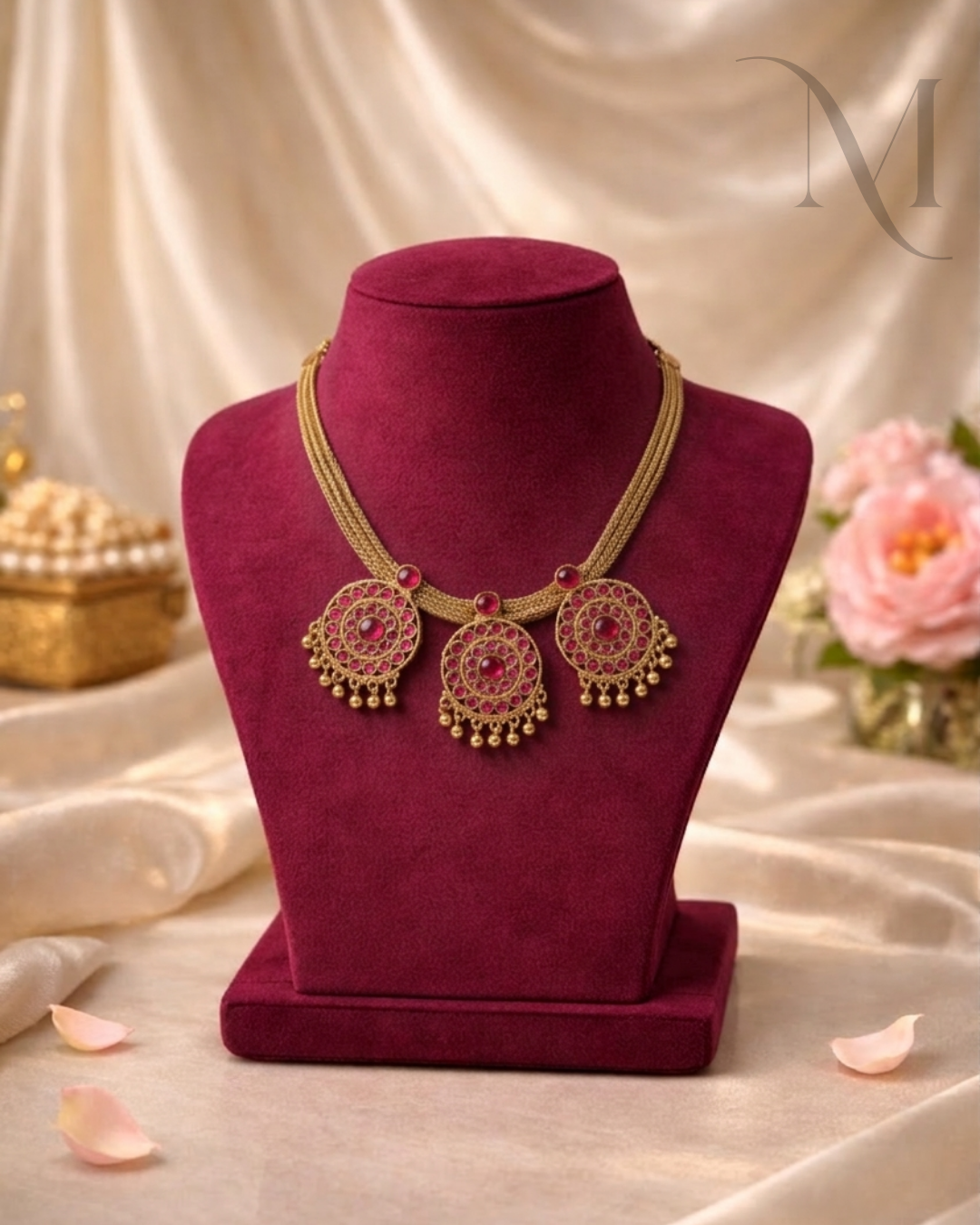 A stunning premium necklace designed with three beautifully detailed mandala-style circular pendants that create a bold yet elegant statement.