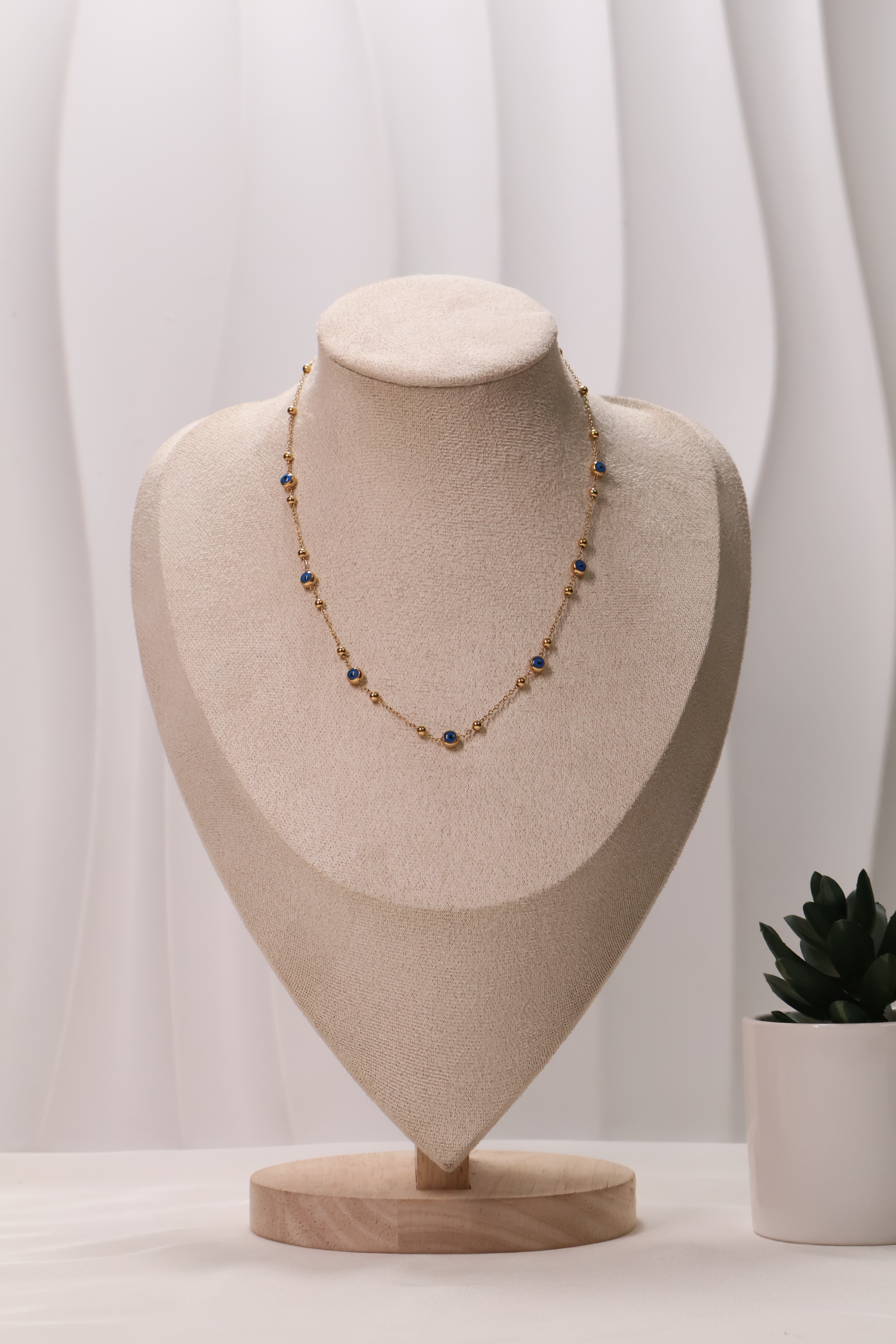 This refined gold chain necklace features delicate blue stone accents interlinked with golden beads, creating a perfect balance of simplicity and charm. Its subtle design makes it ideal for daily wear or layering with other jewelry pieces. The soft golden shine paired with the cool blue stones adds a graceful touch to any outfit, from casual to formal.