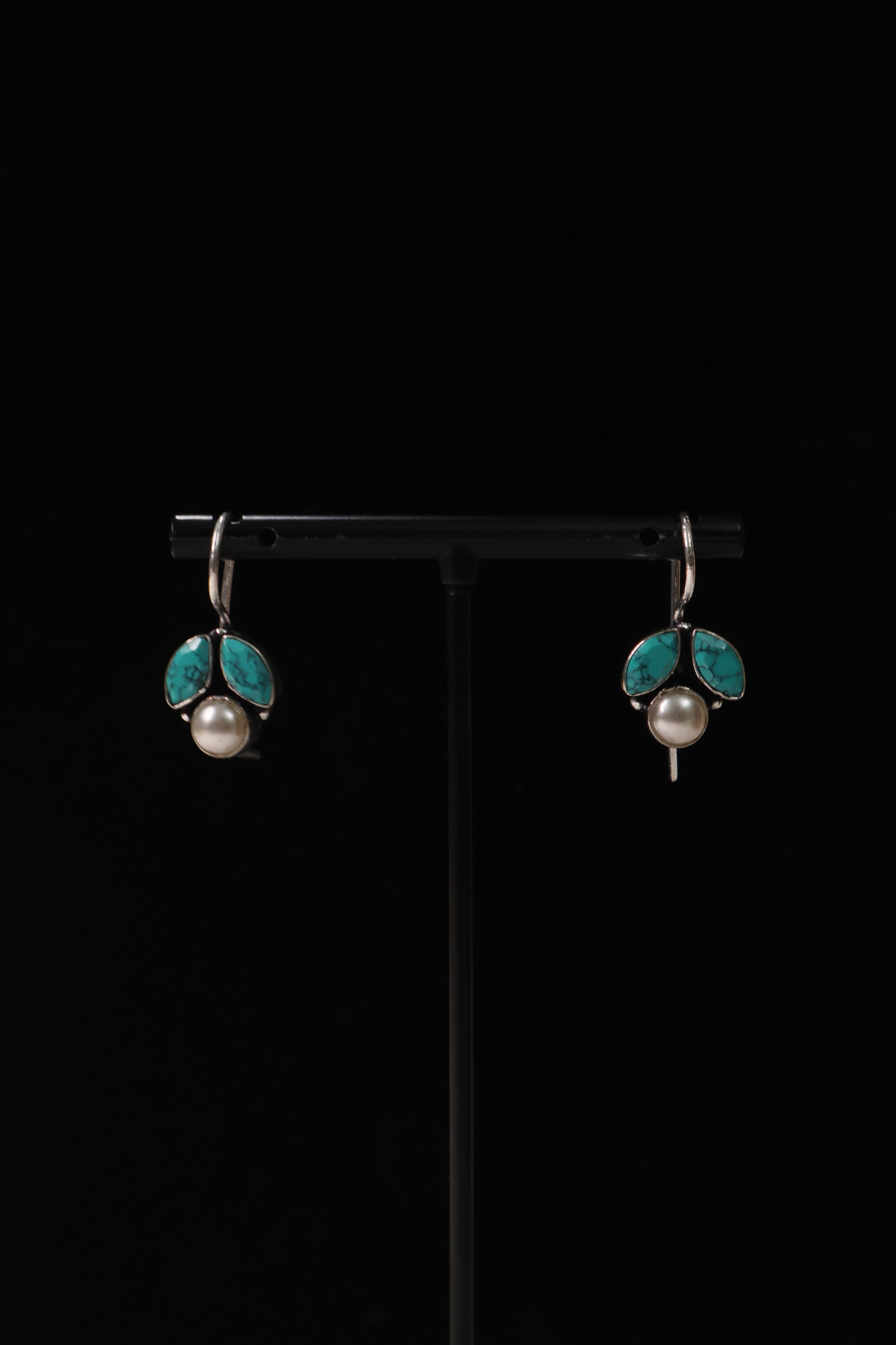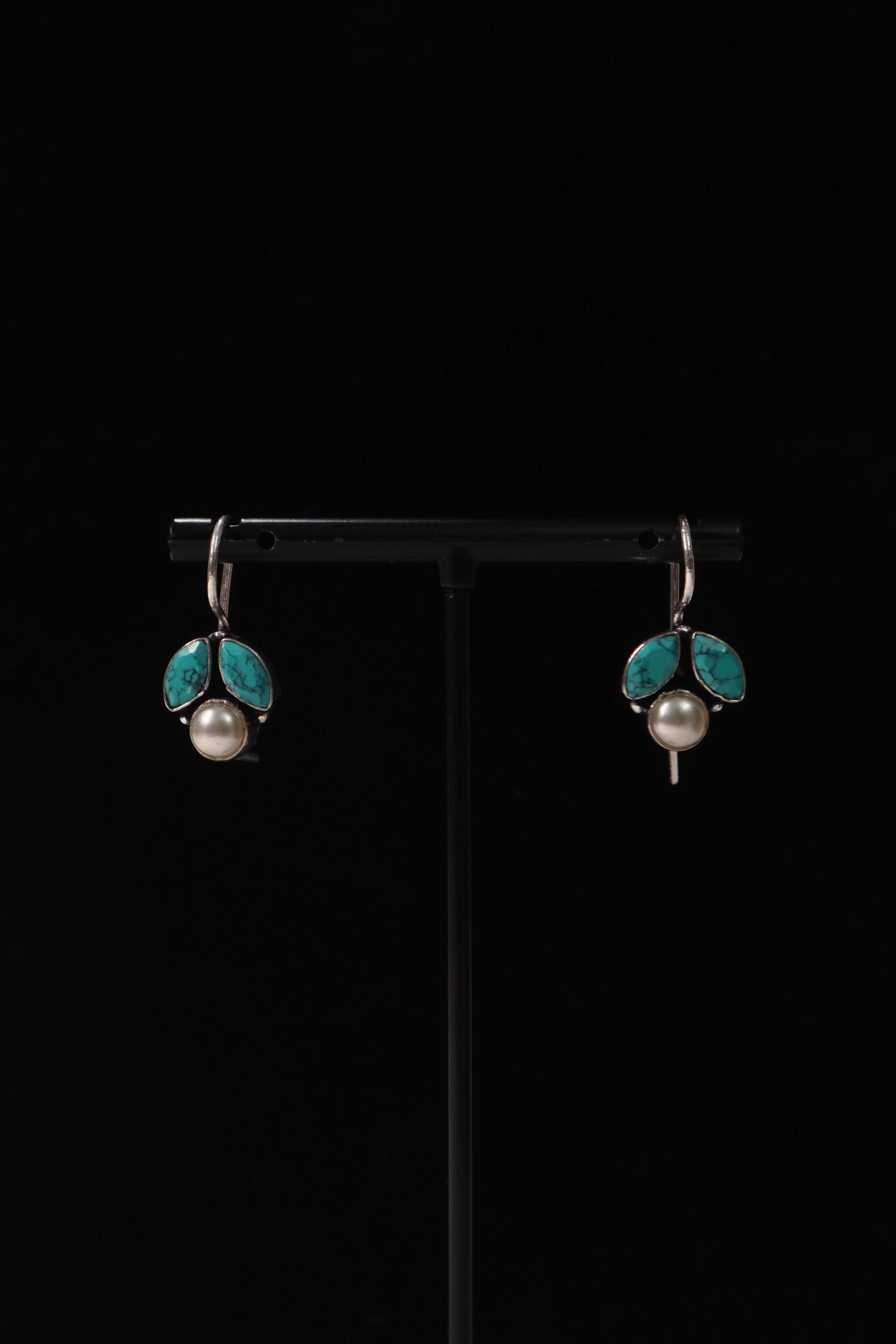 These elegant earrings feature a stunning combination of turquoise stones shaped like delicate leaves and a lustrous pearl drop beneath. Set in a sleek silver-toned frame, the design exudes a refined charm inspired by nature’s grace. Perfect for adding a pop of color and sophistication to both casual and formal outfits.