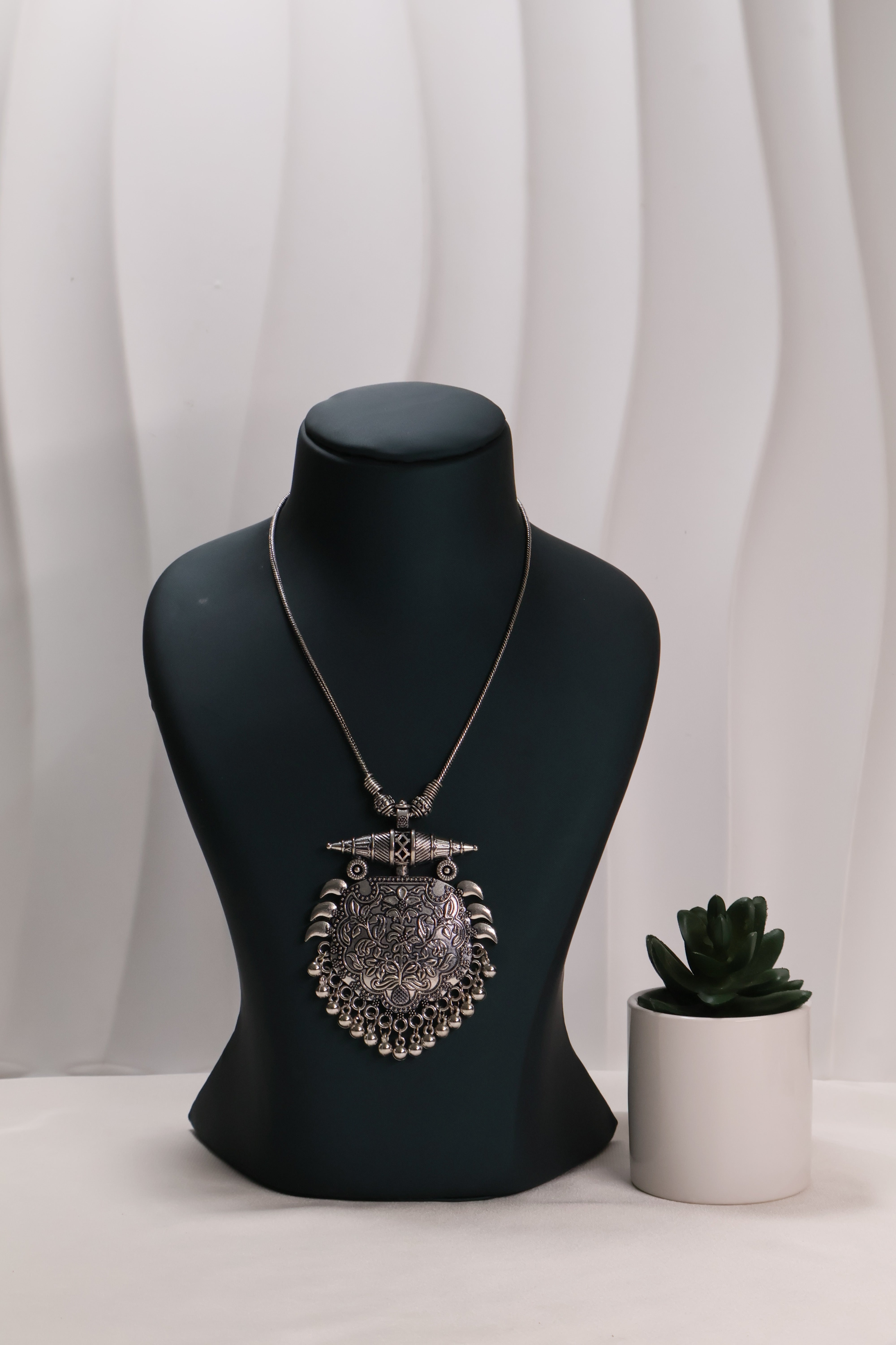 This captivating antique silver necklace features an intricately carved oversized pendant with floral and geometric motifs, reflecting rich tribal artistry. The ornate detailing, paired with dangling bead accents, adds movement and charm to the piece. Perfect for making a statement, this necklace complements ethnic and boho ensembles with timeless elegance and bold character.