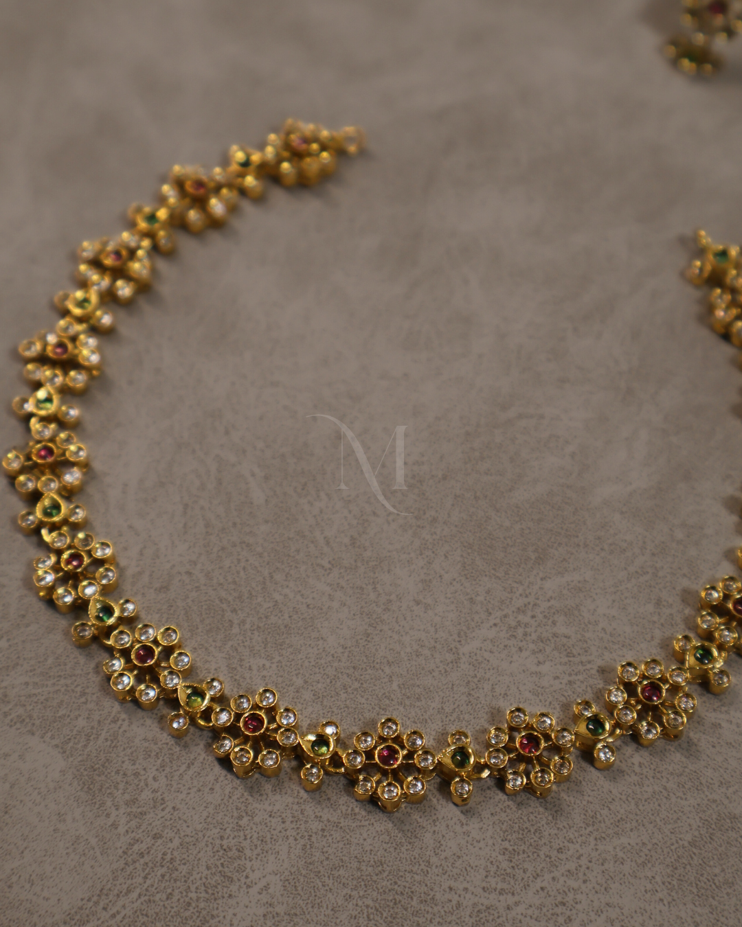 This charming necklace features an intricate floral design adorned with sparkling white stones and accented by rich ruby-red centers. The flowers are delicately linked in a continuous pattern, set in lustrous gold for a timeless appeal. Perfect for traditional occasions, weddings, and festive celebrations, this piece beautifully combines elegance and heritage, making it a treasured addition to any jewelry collection.